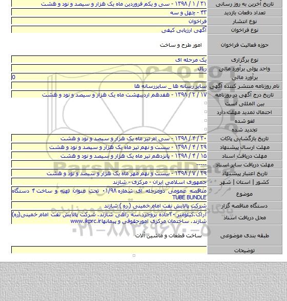 مناقصه عمومی دومرحله ای شماره ۰۱/۹۸ تحت عنوان تهیه و ساخت ۴ دستگاه TUBE BUNDLE
