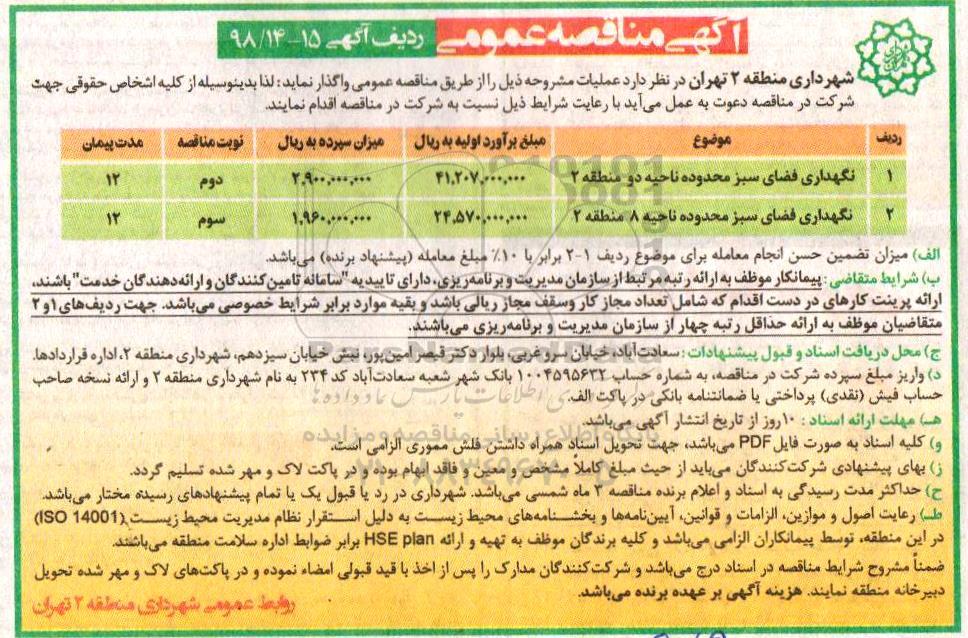 شهرداری منطقه 2 تهران در نظر دارد عملیات مشروحه ذیل را از طریق مناقصه عمومی واگذار نماید. لذا بدینوسیله از کلیه اشخاص حقوقی جهت شرکت در مناقصه دعوت به عمل می آید.با رعایت شرایط ذیل نسبت به شرکت در مناقصه اقدام نمایند.