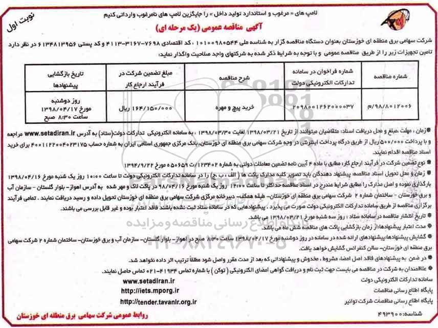 شرکت سهامی برق منطقه ای خوزستان به عنوان دستگاه مناقصه گزار به شناسه ملی 10100980544، کد اقتصادی 7698- 3167- 4113 و کدپستی 6134813956 در نظر دارد تامین تجهیزات زیر را از طریق مناقصه عمومی و با توجه به شرایط ذکر شده به شرکتهای واجد صلاحیت واگذار نماید: