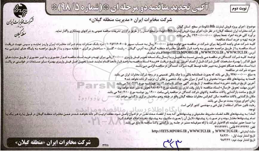 شرکت مخابرات ایران منطقه گیلان درنظردارد اجرای پروژه فروش اینترنت ftth (