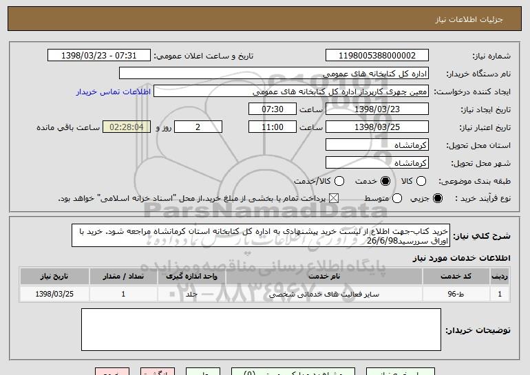 شرح کلی نیاز: خرید کتاب-جهت اطلاع از لیست خرید پیشنهادی به اداره کل کتابخانه استان کرمانشاه مراجعه شود. خرید با اوراق سررسید26/6/98
