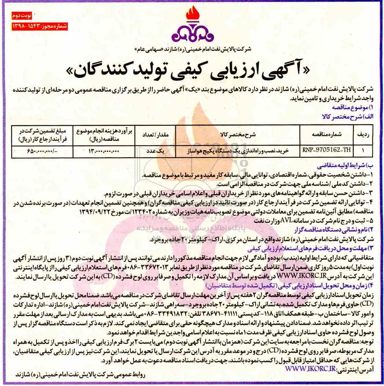 شرکت پالایش نفت امام خمینی (ره) شازند در نظر دارد کالاهای موضوع بند یک آگهی حاضر را از طریق برگزاری مناقصه عمومی دو مرحله ای از تامین کنندگان- تولید کنندگان واجد شرایط خریداری و تامین نماید.