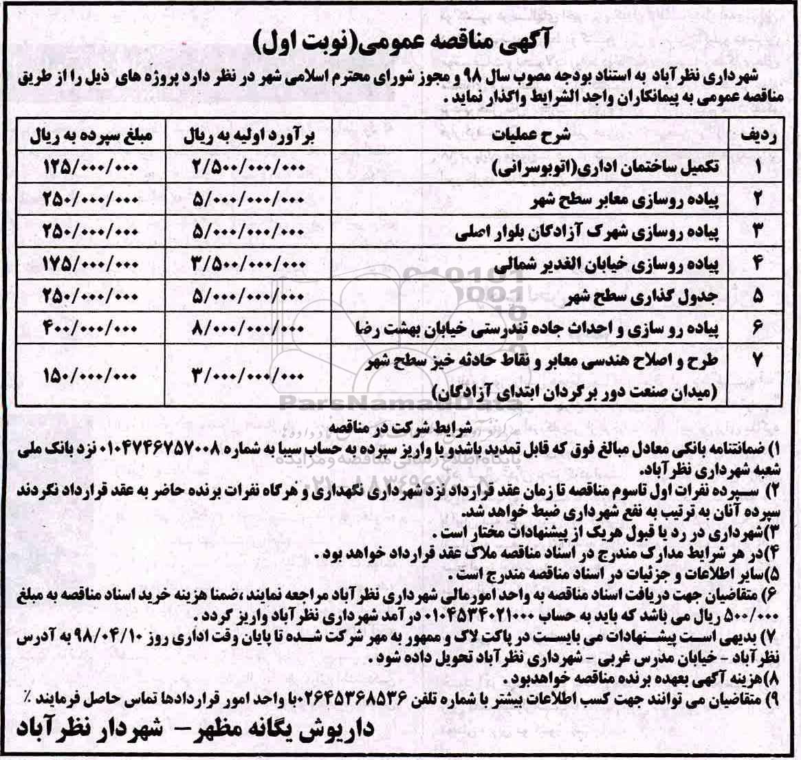 شهرداری نظرآباد در نظر دارد پروژه های ذیل را از طریق مناقصه عمومی به پیمانکاران واجد الشرایط واگذار نماید.