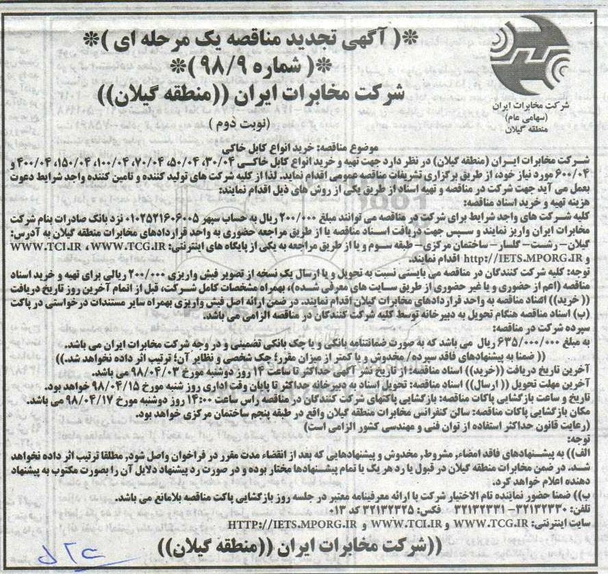 شرکت مخابرات ایران منطقه گیلان در نظر دارد جهت تهیه و خرید انواع کابل خاکی 30/04 ، 50/04 ، 70/04 ، 100/04 ، 150/04 ، 400/04 ، 600/04 مورد نیاز خود از طریق برگزاری تشریفات مناقصه عمومی اقدام نماید