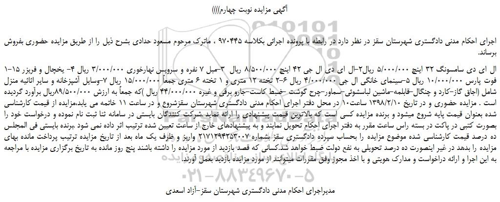 1-ال ای دی سامسونگ 32 اینچ 5/000/000 ریال2-ال ای دی ال جی 42 اینچ 8/500/000 ریال  3-مبل 7 نفره و سرویس نهارخوری 3/000/000 ریال 4- یخچال و فریزر 15 فوت پارس 10/000/000 ریال 5-سینمای خانگی ال جی 4/000/000 ریال 6-2 تخته 12 متری و 1 تخته 6 متری جمعاً 15/000/000 ریال 7-وسایل آشپزخانه و سایر اثاثیه منزل شامل (اجاق گاز-کارد و چنگال-قابلمه-ماشین لباسشوئی-سماور-چرح گوشت -ضبط کاست-جارو برقی و غیره 44/000/000 ریال )که جمعاً به ارزش 89/500/000ریال برآورد گردیده است . مزایده حضوری و در تاریخ 1398/2/10 ساعت10 در محل دفتر اجرای احکام مدنی دادگستری شهرستان سقزشروع و در ساعت 11 خاتمه می یابد،مزایده از قیمت کارشناسی شده بعنوان قیمت پایه شروع میشود و برنده مزایده کسی است که بالاترین قیمت پیشنهادی را ارائه نماید .شرکت کنندگان بایستی در سامانه ثنا ثبت نام نموده و درخواست خود را بصورت کتبی در پاکت در بسته راس ساعت مقرر به دفتر اجرای احکام تحویل نمایند و به پیشنهادهای خارج از ساعت تعیین شده ترتیب اثر داده نمی شود .برنده بایستی فی المجلس ده درصد قیمت کارشناسی شده موضوع مزایده را بحساب سپرده دادگستری سقز بشماره 2171294253007 واریز و ظرف یک ماه بعد از تاریخ مزایده ترتیب پرداخت مانده بهای مزایده را بدهد در غیر اینصورت ده درصد تحویلی به نفع دولت ضبط خواهد شد.کسانی که قصد بازدید از مورد مزایده را داشته باشند پنج روز مانده به تاریخ برگزاری مزایده با مراجعه به این اجرا و ارائه دراخواست و مدارک هویتی و با اخذ مجوز وفق مقررات میتوانند از مورد مزایده بازدید بعمل آورند.