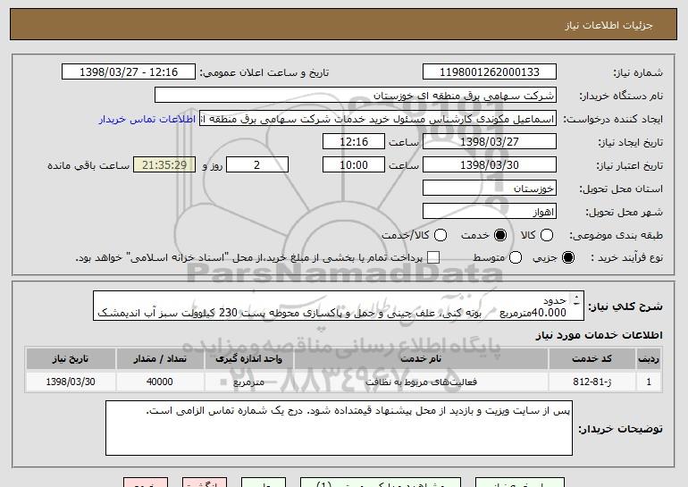 استعلام حدود 40.000مترمربع بوته کنی، علف چینی و حمل و پاکسازی محوطه پست 230 کیلوولت سبز آب اندیمشک م خروج کامل کامل محوطه بشر ح ذیل : , استعلام حدود 40.000مترمربع بوته کنی، علف چینی و حمل و پاکسازی محوطه پست 230 کیلوولت سبز آب اندیمشک م خروج کامل کامل محوطه بشر ح ذیل :