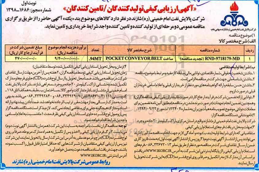 ارزیابی کیفی ساخت POCKET CONVEYOR BELT از کلیه افراد متخصص و شرکتها واجد شرایط دعوت به عمل میآید در مناقصه با کد خبرگزاری پارس نماد: 1709502 شرکت نمایند.