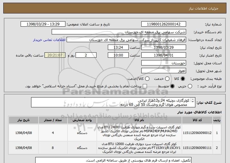 استعلام کولرگازی دوتیکه 24 و12هزار ایرانی مخصوص هوای گرم وخشک 55 الی 65 درجه ایران کد مشابه بوده وکالا طبق فرم پیشنهاد قیمت پیوست خریداری می گردد . , استعلام کولرگازی دوتیکه 24 و12هزار ایرانی مخصوص هوای گرم وخشک 55 الی 65 درجه ایران کد مشابه بوده وکالا طبق فرم پیشنهاد قیمت پیوست خریداری می گردد .