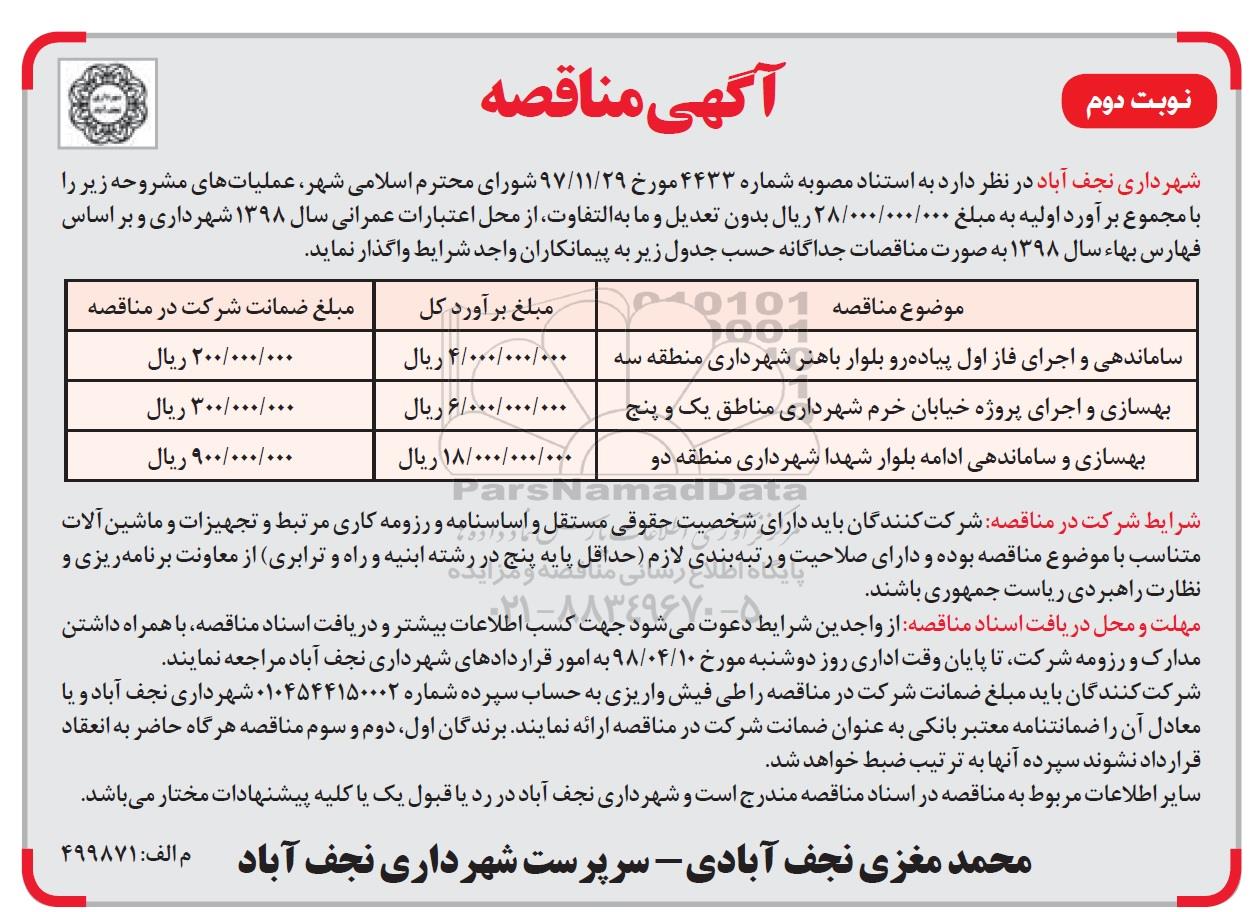 شهرداری نجف آباد در نظر دارد عملیات های مشروحه زیر را با مجموع برآورد اولیه به مبلغ 28.000.000.000 ریال بدون تعدیل و ما به التفاوت از محل اعتبارات عمرانی سال 98 شهرداری و براساس فهرست بهاء سال 1398 به صورت مناقصات جداگانه حسب جدول زیر به پیمانکاران واجد شرایط واگذار نماید.