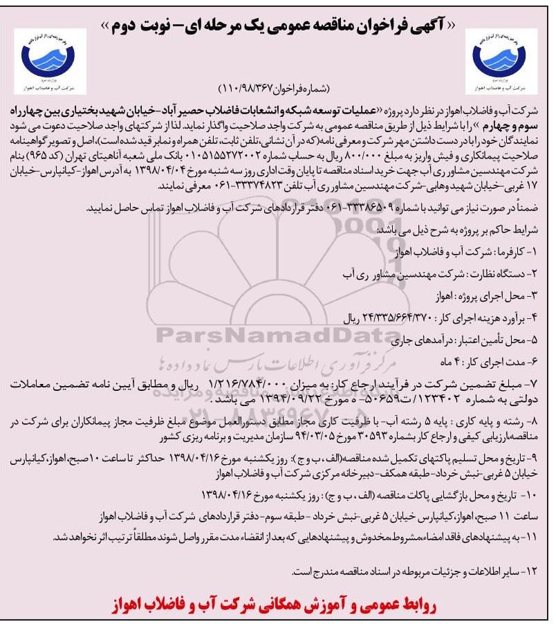 شرکت آب و فاضلاب اهواز در نظر دارد پروژه عملیات توسعه شبکه و انشعابات فاضلاب حصیرآباد - خیابان شهید بختیاری بین چهارراه سوم و چهارم را با شرایط ذیل از طریق مناقصه عمومی به شرکت واجد صلاحیت واگذار نماید. لذا از شرکت های واجد صلاحیت دعوت می شود، نمایندگان خود را با در دست داشتن مهر شرکت و معرفی نامه (که در آن نشانی، تلفن ثابت، تلفن همراه و نمابر قید است)، اصل و تصویر گواهینامه صلاحیت پیمانکاری و فیش واریز به مبلغ 800.000 ریال به حساب جام شماره 0105155272002 بانک ملی شعبه آناهیتای تهران کد 965 به نام شرکت مهندسین مشاور ری آب جهت خرید اسناد مناقصه تا پایان وقت اداری روز سه شنبه مورخ 98.4.4 به آدرس: اهواز، کیانپارس، خیابان 17 غربی- خیابان شهید وهابی، شرکت مهندسین مشاور ری اب تلفن شماره تلفن 33374823-061 معرفی نمایند