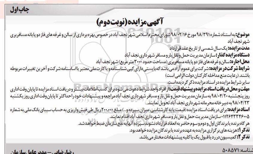 موضوع: به استناد مصوبه شماره 98/391 مورخ 98.02.16 شورای محترم اسلامی شهر نجف آباد در خصوص بهره برداری از سالن و غرفه های فاز دو پایانه مسافربری شهر نجف آباد