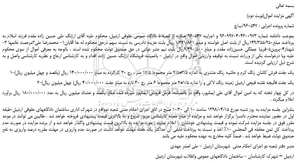 شعبه صادر کننده:شعبه دوم اجرای احکام مدنی دادگستری شهرستان اردبیل/قدیم