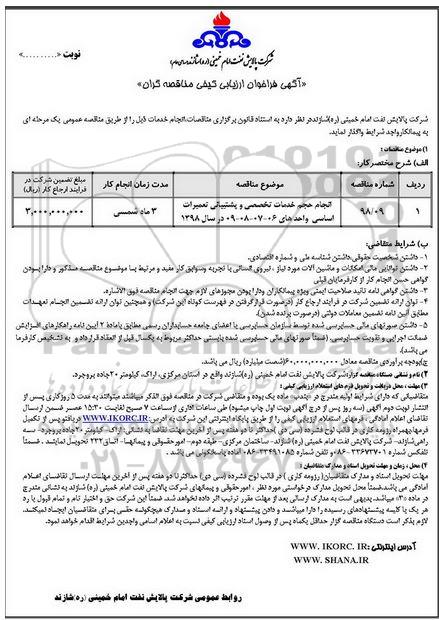 شرکت پالایش نفت امام خمینی (ره) شازند در نظر دارد به استناد قانون برگزاری مناقصات انجام خدمات ذیل را از طریق مناقصه عمومی دو مرحله ای به پیمانکار واجد شرایط واگذار نماید.