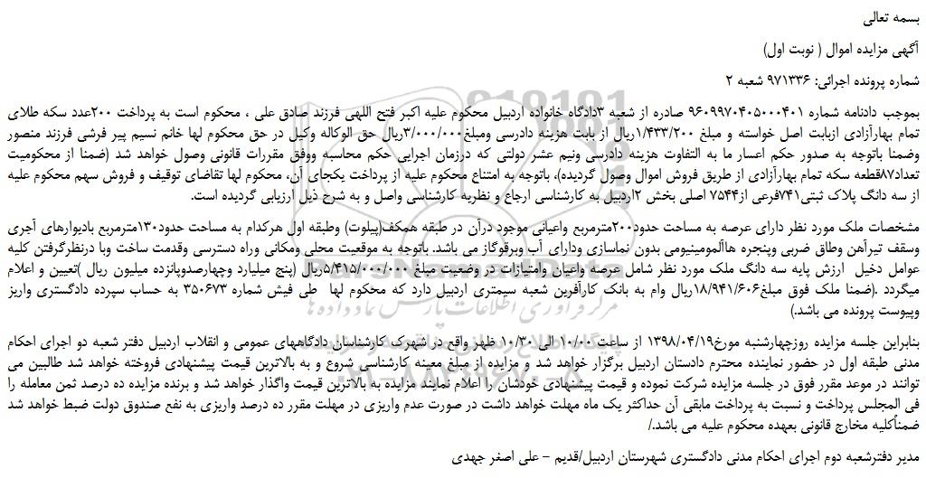 بنابراین جلسه مزایده روزچهارشنبه مورخ1398/04/19 از ساعت 10/00 الی 10/30 ظهر واقع در شهرک کارشناسان دادگاههای عمومی و انقلاب اردبیل دفتر شعبه دو اجرای احکام مدنی طبقه اول در حضور نماینده محترم دادستان اردبیل برگزار خواهد شد و مزایده از مبلغ معینه کارشناسی شروع و به بالاترین قیمت پیشنهادی فروخته خواهد شد طالبین می توانند در موعد مقرر فوق در جلسه مزایده شرکت نموده و قیمت پیشنهادی خودشان را اعلام نمایند مزایده به بالاترین قیمت واگذار خواهد شد و برنده مزایده ده درصد ثمن معامله را فی المجلس پرداخت و نسبت به پرداخت مابقی آن حداکثر یک ماه مهلت خواهد داشت در صورت عدم واریزی در مهلت مقرر ده درصد واریزی به نفع صندوق دولت ضبط خواهد شد ضمناً کلیه مخارج قانونی بعهده محکوم علیه می باشد./