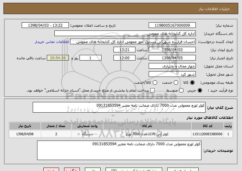 شرح کلی نیاز: کولر لورچ معمولی مدل 7000 دارای ضمانت نامه معتبر 09131853594