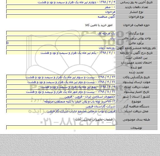 مناقصه, ۹۸-۱۳خرید لوله یاب و پلی اتیلن با کلیه متعلقات مربوطه از کلیه افراد متخصص و شرکتها واجد شرایط دعوت به عمل میآید در مناقصه با کد خبرگزاری پارس نماد: 1727233 شرکت نمایند.