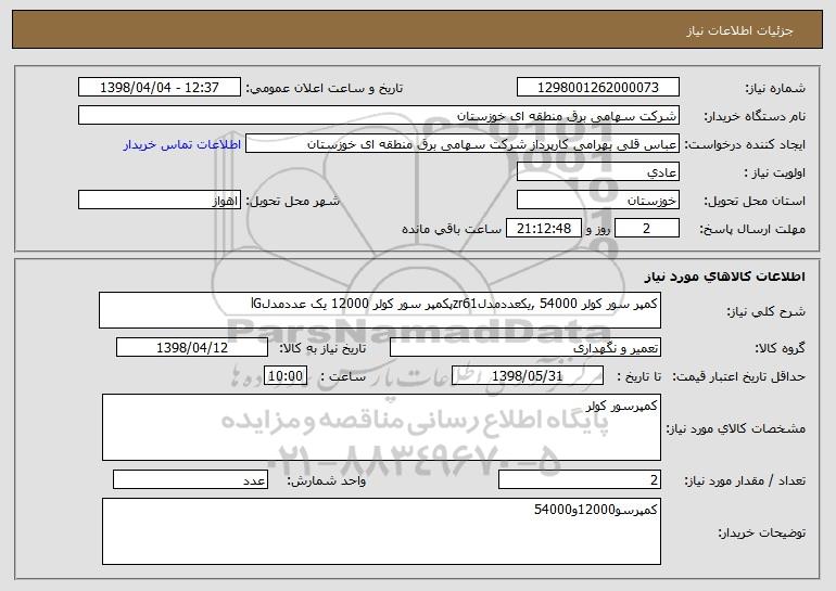 شرح کلی نیاز: کمپر سور کولر 54000 ,یکعددمدلzr61پکمپر سور کولر 12000 یک عددمدلlG