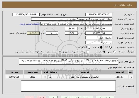 شرح کلی نیاز: موضوع درخواست تخلیه حدود 12000 تن برنج و بارگیری 12000 تن برنج در انبارهای شهرستان تربت حیدریه