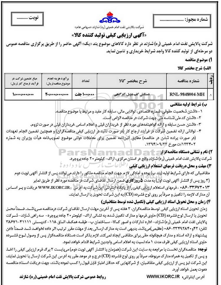 ارزیابی کیفی دستکش کف دوبل کارگاهی از کلیه افراد متخصص و شرکتها واجد شرایط دعوت به عمل میآید در مناقصه با کد خبرگزاری پارس نماد: 1731231 شرکت نمایند.