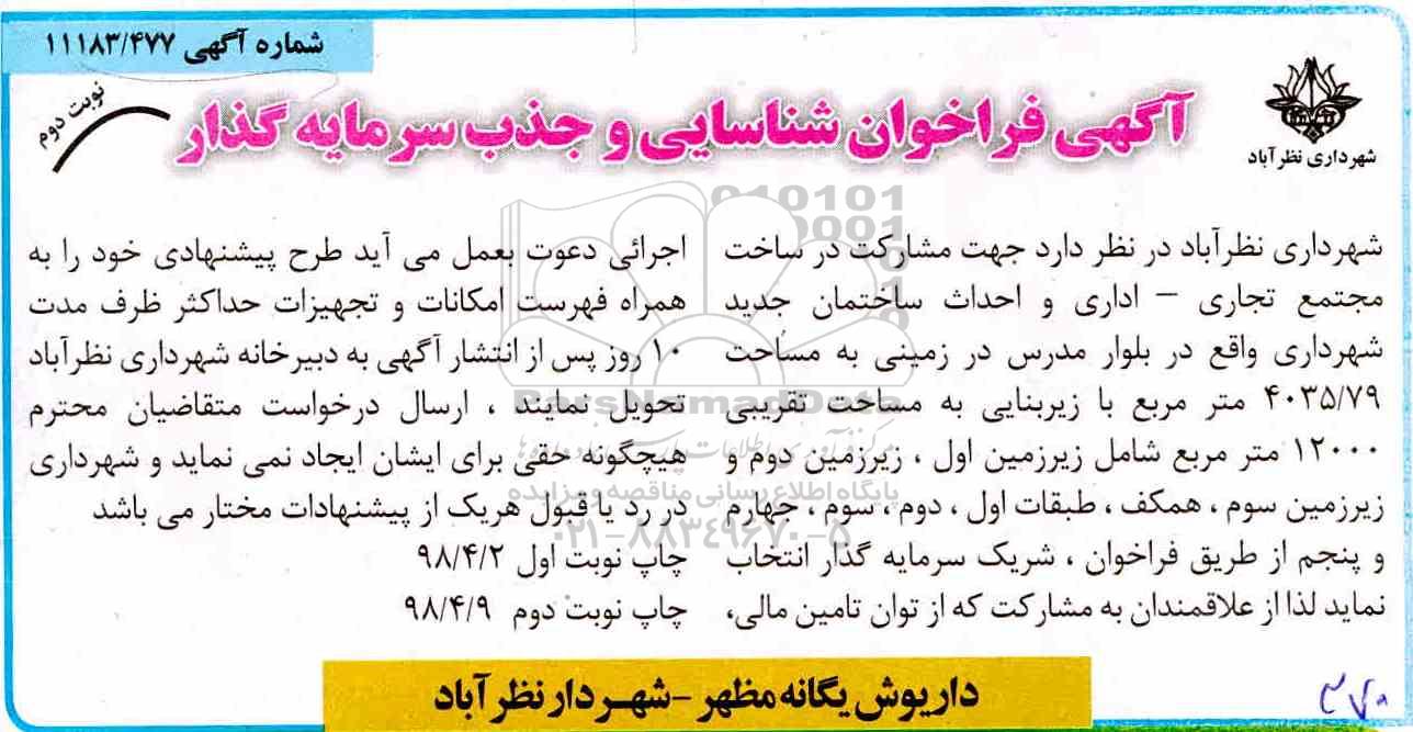 شهرداری نظرآباد در نظر دارد جهت مشارکت در ساخت مجتمع تجاری، اداری و احداث ساختمان جدید شهرداری واقع در بلوار مدرس در زمینی به مساحت 4035/79 متر مربع با زیربنایی به مساحت تقریبی 12000 متر مربع شامل زیرزمین اول، زیرزمین دوم و زیرزمین سوم، همکف، طبقات اول، دوم، سوم، چهارم و پنجم از طریق فراخوان، شریک سرمایه گذار انتخاب نماید لذا از علاقمندان به مشارکت که از توان تامین مالی اجرائی دعوت به عمل می آید طرح پیشنهادی خود را به همراه فهرست امکانات و تجهیزات حداکثر ظرف مدت ده روز پس از انتشار آگهی به دبیرخانه شهرداری نظرآباد تحویل نمایند ارسال درخواست متقاضیان محترم هیچ گونه حقی برای ایشان ایجاد نمی یابد و شهرداری در رد یا قبول هر یک از پیشنهادات مختار می باشد