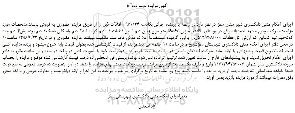 اجرای احکام مدنی دادگستری شهر ستان سقز در نظر دارد در رابطه با پرونده اجرائی بکلاسه 971134 ، املاک ذیل را از طریق مزایده حضوری به فروش برساند.مشخصات مورد مزایده: ماترک مرحوم محمد احمدزاده واقع در روستای قلندر بمیزان 59563 متر مربع زمین دیم شامل قطعات 1- دیم کوه شامه2-دیم راه کانی ناسک3-دیم برده رش4-دیم چیه که5-دیم تپه کمباین که ارزش کل قطعات 512/768/000ریال برآورد گردیده است.ضمناً املاک مذکور فاقد سند مالکیت میباشد .مزایده حضوری و در تاریخ 1398/4/23 ساعت10 در محل دفتر اجرای احکام مدنی دادگستری شهرستان سقزشروع و در ساعت 11 خاتمه می یابد،مزایده از قیمت کارشناسی شده بعنوان قیمت پایه شروع میشود و برنده مزایده کسی است که بالاترین قیمت پیشنهادی را ارائه نماید .شرکت کنندگان بایستی در سامانه ثنا ثبت نام نموده و درخواست خود را بصورت کتبی در پاکت در بسته راس ساعت مقرر به دفتر اجرای احکام تحویل نمایند و به پیشنهادهای خارج از ساعت تعیین شده ترتیب اثر داده نمی شود .برنده بایستی فی المجلس ده درصد قیمت کارشناسی شده موضوع مزایده را بحساب سپرده دادگستری سقز بشماره 2171294253007 واریز و ظرف یک ماه بعد از تاریخ مزایده ترتیب پرداخت مانده بهای مزایده را بدهد در غیر اینصورت ده درصد تحویلی به نفع دولت ضبط خواهد شد.کسانی که قصد بازدید از مورد مزایده را داشته باشند پنج روز مانده به تاریخ برگزاری مزایده با مراجعه به این اجرا و ارائه دراخواست و مدارک هویتی و با اخذ مجوز وفق مقررات میتوانند از مورد مزایده بازدید بعمل آورند.