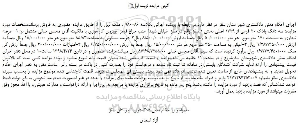 اجرای احکام مدنی دادگستری شهر ستان سقز در نظر دارد در رابطه با پرونده اجرائی بکلاسه 980086 ، ملک ذیل را از طریق مزایده حضوری به فروش برساند. مشخصات مورد مزایده: سه دانگ پلاک 20 فرعی از 1729 اصلی بخش 1 سقز واقع در سقز-خیابان شهدا-جنب چراغ قرمز-روبروی کارآموزی با مالکیت آقای محسن خیالی مشتمل بر: 1- عرصه تجاری به مساحت 170 متر مربع هر متر 50/000/000 ریال جمعاً به ارزش 8/500/000/000 ریال2-عرصه مسکونی به مساحت85/83 متر مربع هر متر 15/000/000 ریال جمعاً به ارزش 1/287/450/000 ریال 3-اعیانی به مساحت 450 متر مربع هر متر 15/000/000 ریال جمعاً به ارزش 6/750/000/000 ریال 4-امتیازات 200/000/000 ریال جمعاً ارزش کل ملک 16/737/450/000 ریال برآورد گردیده است که سهم آقای محسن خیالی 8/368/725/000 ریال میباشد.مزایده حضوری و در تاریخ 1398/4/24 ساعت10 در محل دفتر اجرای احکام مدنی دادگستری شهرستان سقزشروع و در ساعت 11 خاتمه می یابد،مزایده از قیمت کارشناسی شده بعنوان قیمت پایه شروع میشود و برنده مزایده کسی است که بالاترین قیمت پیشنهادی را ارائه نماید .شرکت کنندگان بایستی در سامانه ثنا ثبت نام نموده و درخواست خود را بصورت کتبی در پاکت در بسته راس ساعت مقرر به دفتر اجرای احکام تحویل نمایند و به پیشنهادهای خارج از ساعت تعیین شده ترتیب اثر داده نمی شود .برنده بایستی فی المجلس ده درصد قیمت کارشناسی شده موضوع مزایده را بحساب سپرده دادگستری سقز بشماره 2171294253007 واریز و ظرف یک ماه بعد از تاریخ مزایده ترتیب پرداخت مانده بهای مزایده را بدهد در غیر اینصورت ده درصد تحویلی به نفع دولت ضبط خواهد شد.کسانی که قصد بازدید از مورد مزایده را داشته باشند پنج روز مانده به تاریخ برگزاری مزایده با مراجعه به این اجرا و ارائه دراخواست و مدارک هویتی و با اخذ مجوز وفق مقررات میتوانند از مورد مزایده بازدید بعمل آورند.