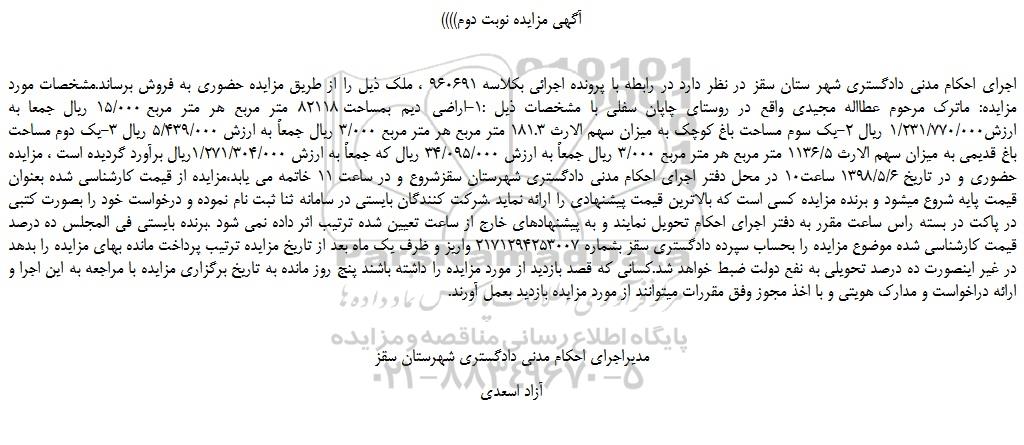 اجرای احکام مدنی دادگستری شهر ستان سقز در نظر دارد در رابطه با پرونده اجرائی بکلاسه 960691 ، ملک ذیل را از طریق مزایده حضوری به فروش برساند.مشخصات مورد مزایده: ماترک مرحوم عطااله مجیدی واقع در روستای چاپان سفلی با مشخصات ذیل :1-اراضی دیم بمساحت 82118 متر مربع هر متر مربع 15/000 ریال جمعا به ارزش1/231/770/000 ریال 2-یک سوم مساحت باغ کوچک به میزان سهم الارث 181.3 متر مربع هر متر مربع 3/000 ریال جمعاً به ارزش 5/439/000 ریال 3-یک دوم مساحت باغ قدیمی به میزان سهم الارث 1136/5 متر مربع هر متر مربع 3/000 ریال جمعاً به ارزش 34/095/000 ریال که جمعاً به ارزش 1/271/304/000ریال برآورد گردیده است ، مزایده حضوری و در تاریخ 1398/5/6 ساعت10 در محل دفتر اجرای احکام مدنی دادگستری شهرستان سقزشروع و در ساعت 11 خاتمه می یابد،مزایده از قیمت کارشناسی شده بعنوان قیمت پایه شروع میشود و برنده مزایده کسی است که بالاترین قیمت پیشنهادی را ارائه نماید .شرکت کنندگان بایستی در سامانه ثنا ثبت نام نموده و درخواست خود را بصورت کتبی در پاکت در بسته راس ساعت مقرر به دفتر اجرای احکام تحویل نمایند و به پیشنهادهای خارج از ساعت تعیین شده ترتیب اثر داده نمی شود .برنده بایستی فی المجلس ده درصد قیمت کارشناسی شده موضوع مزایده را بحساب سپرده دادگستری سقز بشماره 2171294253007 واریز و ظرف یک ماه بعد از تاریخ مزایده ترتیب پرداخت مانده بهای مزایده را بدهد در غیر اینصورت ده درصد تحویلی به نفع دولت ضبط خواهد شد.کسانی که قصد بازدید از مورد مزایده را داشته باشند پنج روز مانده به تاریخ برگزاری مزایده با مراجعه به این اجرا و ارائه دراخواست و مدارک هویتی و با اخذ مجوز وفق مقررات میتوانند از مورد مزایده بازدید بعمل آورند.