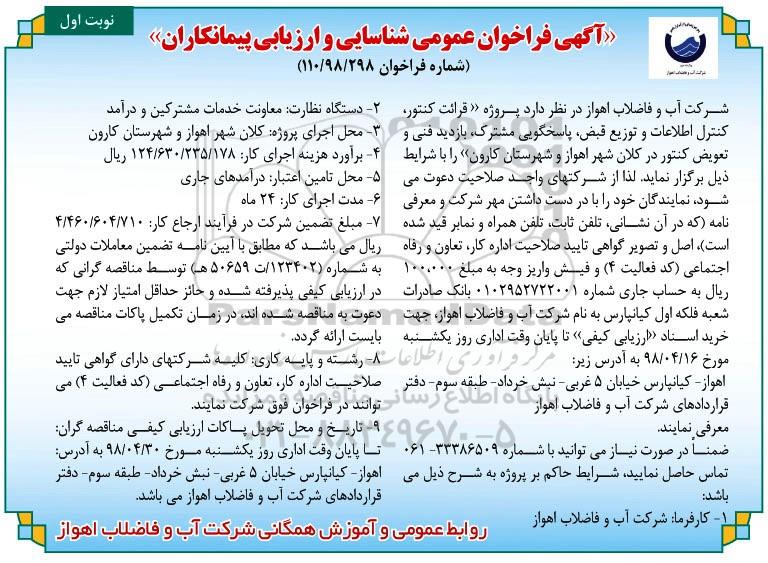 شرکت آب و فاضلاب اهواز در نظر دارد پروژه قرائت کنتور، کنترل اطلاعات و توزیع قبض، پاسخگوئی مشترک، بازدید فنی و تعویض کنتور در کلان شهر اهواز و شهرستان کارون را با شرایط ذیل برگزار نماید