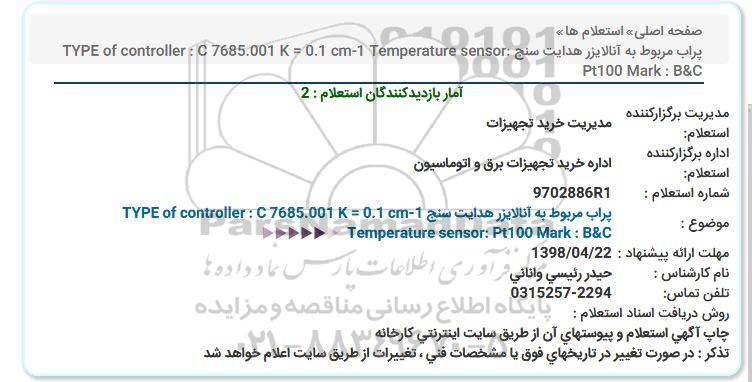 موضوع : پراب مربوط به آنالایزر هدایت سنج TYPE of controller : C 7685.001 K = 0.1 cm-1 Temperature sensor: Pt100 Mark : B&C  مهلت ارائه پیشنهاد : 1398.04.22