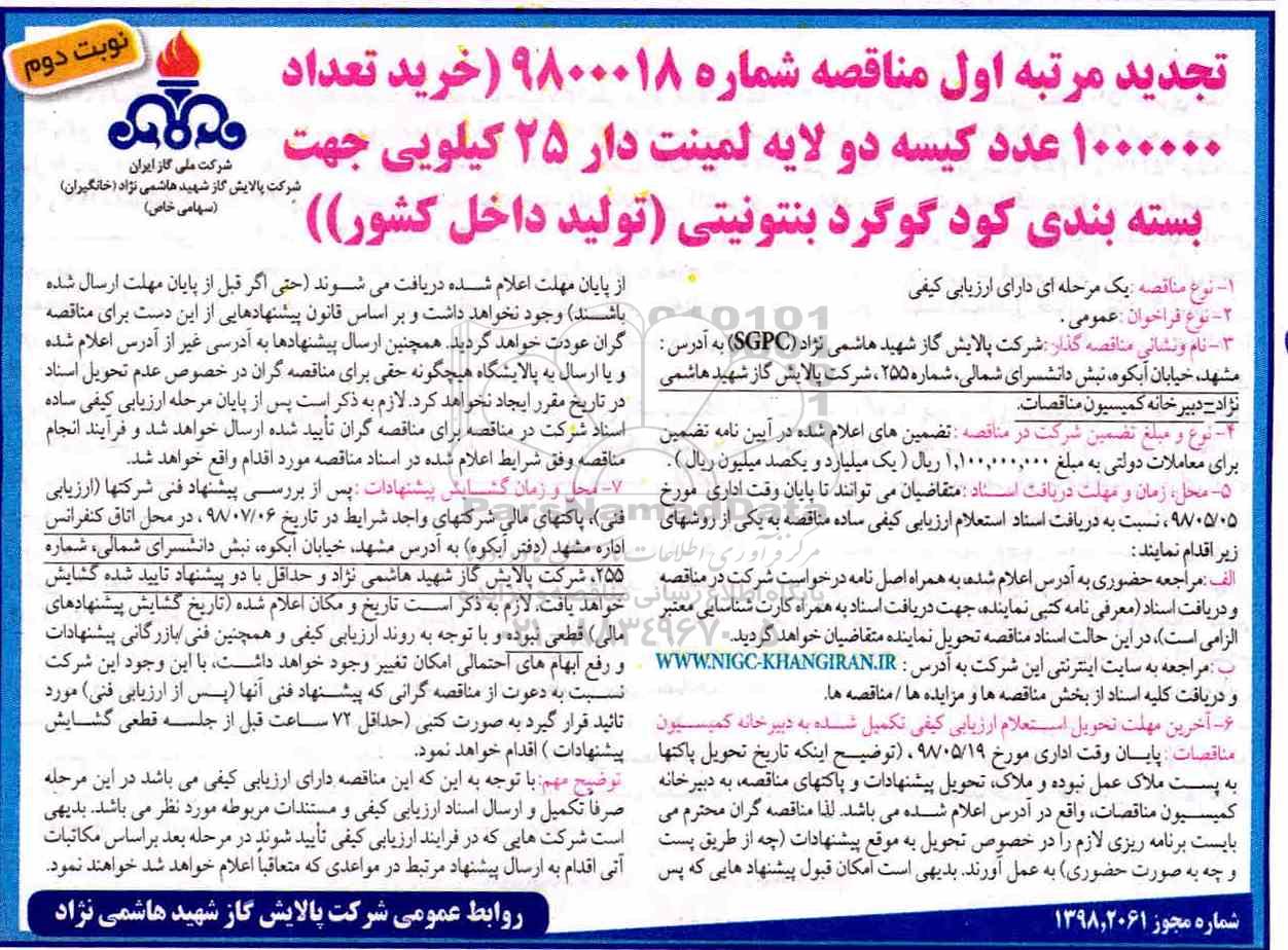 تجدید مناقصه شماره 9800018 (خرید 1000000 عدد کیسه دو لایه لمینت دار 25 کیلویی جهت بسته بندی کود گوگرد بنتونیتی (تولید داخل کشور) ؟ نوبت دوم