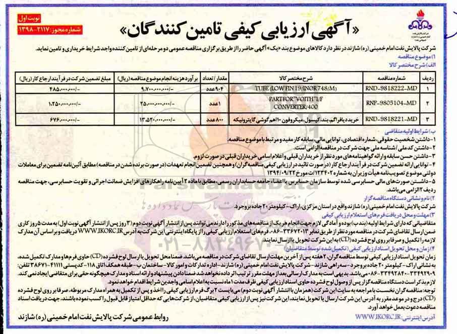 شرکت پالایش نفت امام خمینی (ره) شازند در نظر دارد کالاهای موضوع بند یک آگهی حاضر را از طریق برگزاری مناقصه عمومی دو مرحله ای از تامین کننده واجد شرایط خریداری و تامین نماید.