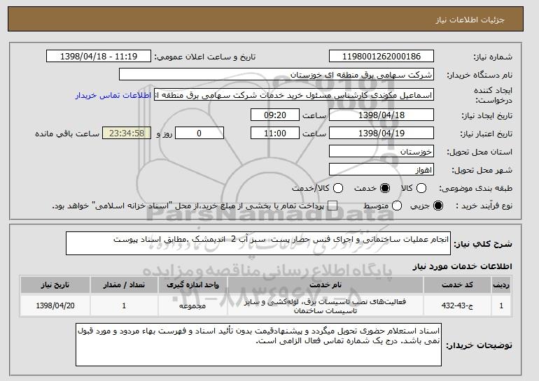 شرح کلی نیاز: انجام عملیات ساختمانی و اجرای فنس حصار پست سبز آب 2 اندیمشک .مطابق اسناد پیوست