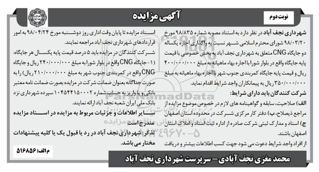 شهرداری نجف آباد در نظر دارد به استناد مصوبه شماره 98/835 مورخ 98.3.20 شورای محترم اسلامی شهر نسبت به واگذاری اجاره یکساله دو جایگاه CNG متعلق به شهرداری نجف آباد به بخش خصوصی با قیمت پایه جایگاه واقع در بلوار شور را با اجاره بها ماهیانه به مبلغ 400.000.000 ریال و قیمت پایه جایگاه کمربندی جنوب شهر با اجاره بها ماهیانه به مبلغ 350.000.000 ریال به پیمانکاران واجد شرایط اقدام نماید