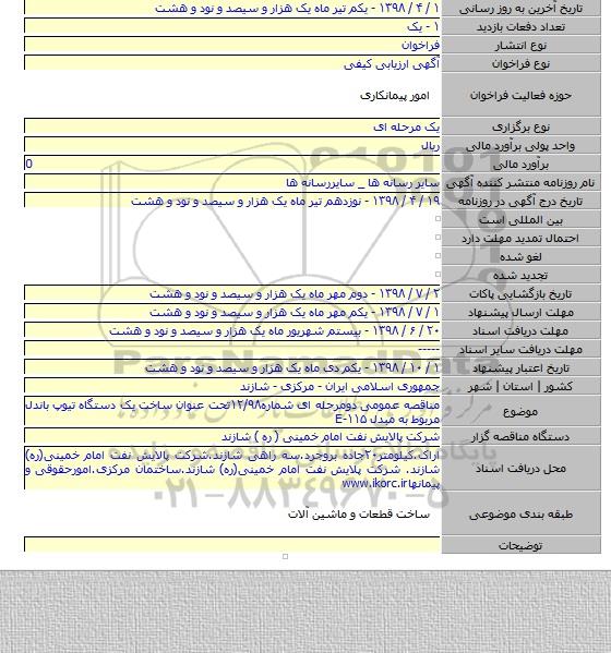 مناقصه عمومی دومرحله ای شماره۱۲/۹۸تحت عنوان ساخت یک دستگاه تیوپ باندل مربوط به مبدل E-۱۱۵