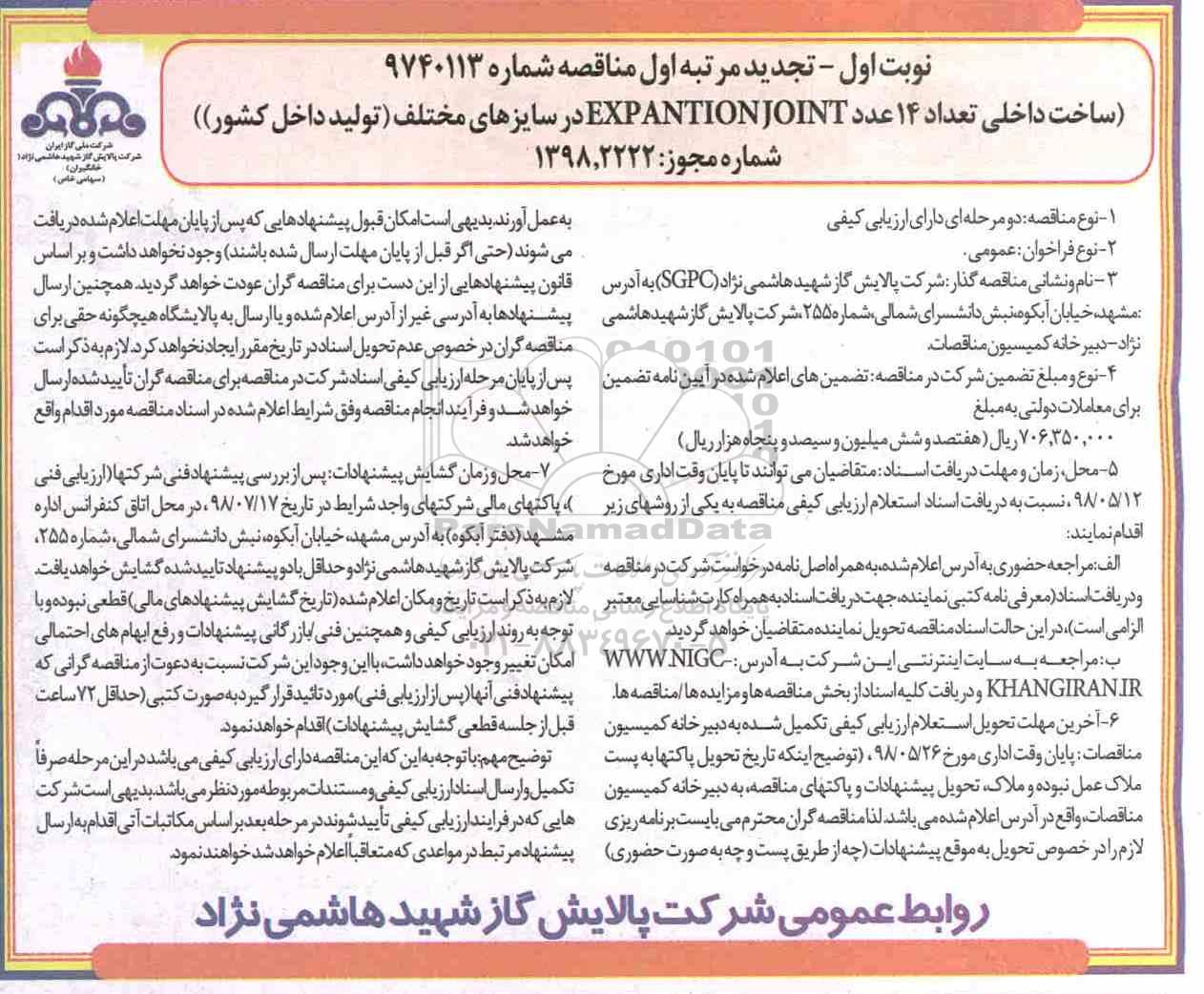 نوبت اول - تجدید مرتبه اول مناقصه شماره 9740113 ( ساخت داخلی تعداد 14 عدد EXPANTION JOINT در سایزهای مختلف (تولید داخل کشور))