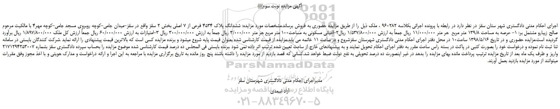 اجرای احکام مدنی دادگستری شهر ستان سقز در نظر دارد در رابطه با پرونده اجرائی بکلاسه 960282 ، ملک ذیل را از طریق مزایده حضوری به فروش برساند.مشخصات مورد مزایده: ششدانگ پلاک 4534 فرعی از 7 اصلی بخش 2 سقز واقع در سقز-میدان جامی-کوچه روبروی مسجد جامی-کوچه مهر4 با مالکیت مرحوم صالح زیبارو مشتمل بر: 1- عرصه به مساحت 139/8 متر مربع  هر متر 11/000/000 ریال جمعاً به ارزش 1/537/800/000 ریال2-اعیانی مسکونی به مساحت100 متر مربع هر متر 3/000/000 ریال جمعاً به ارزش 300/000/000 ریال 3-امتیازات به ارزش 60/000/000 ریال جمعاً ارزش کل ملک 1/897/800/000 ریال برآورد گردیده است.مزایده حضوری و در تاریخ 1398/5/16 ساعت10 در محل دفتر اجرای احکام مدنی دادگستری شهرستان سقزشروع و در ساعت 11 خاتمه می یابد،مزایده از قیمت کارشناسی شده بعنوان قیمت پایه شروع میشود و برنده مزایده کسی است که بالاترین قیمت پیشنهادی را ارائه نماید .شرکت کنندگان بایستی در سامانه ثنا ثبت نام نموده و درخواست خود را بصورت کتبی در پاکت در بسته راس ساعت مقرر به دفتر اجرای احکام تحویل نمایند و به پیشنهادهای خارج از ساعت تعیین شده ترتیب اثر داده نمی شود .برنده بایستی فی المجلس ده درصد قیمت کارشناسی شده موضوع مزایده را بحساب سپرده دادگستری سقز بشماره 2171294253007 واریز و ظرف یک ماه بعد از تاریخ مزایده ترتیب پرداخت مانده بهای مزایده را بدهد در غیر اینصورت ده درصد تحویلی به نفع دولت ضبط خواهد شد.کسانی که قصد بازدید از مورد مزایده را داشته باشند پنج روز مانده به تاریخ برگزاری مزایده با مراجعه به این اجرا و ارائه دراخواست و مدارک هویتی و با اخذ مجوز وفق مقررات میتوانند از مورد مزایده بازدید بعمل آورند.