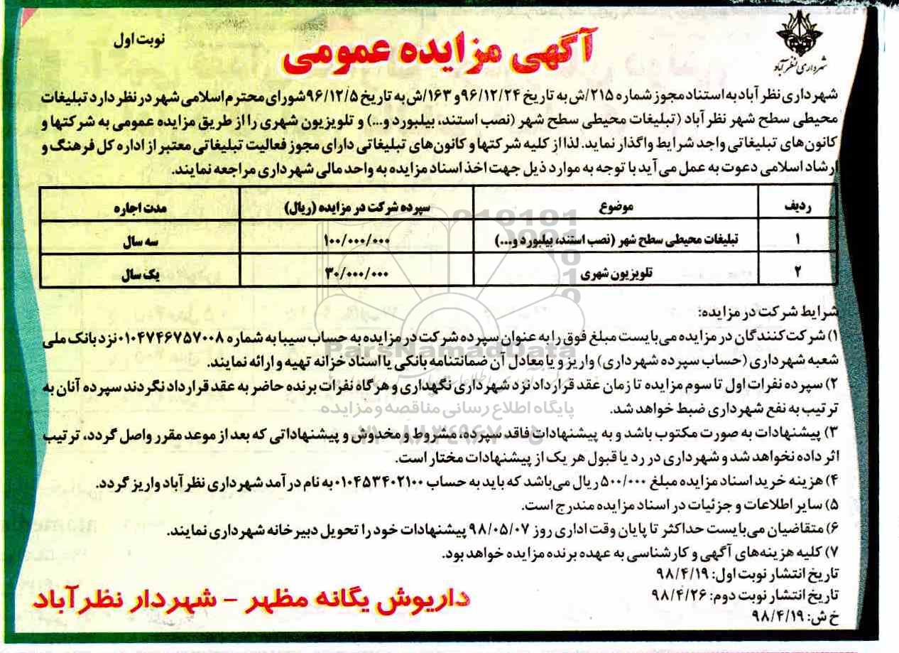 شهرداری نظرآباد به استناد مجوز شماره 215/ ش به تاریخ 96.12.24 و 163/ش به تاریخ 96.12.5 شورای محترم اسلامی شهر در نظر دارد تبلیغات محیطی سطح شهر نظرآباد (تبلیغات محیطی سطح شهر (نصب استند، بیلبورد و...) و تلویزیون شهری را از طریق مزایده عمومی به شرکتها و کانون های تبلیغاتی واجد شرایط واگذار نماید. لذا از کلیه شرکتها و کانون های تبلیغاتی دارای مجوز فعالیت تبلیغاتی معتبر از اداره کل فرهنگ و ارشاد اسلامی دعوت به عمل می آید با توجه به موارد ذیل جهت اخذ اسناد مزایده به واحد مالی شهرداری مراجعه نمایند