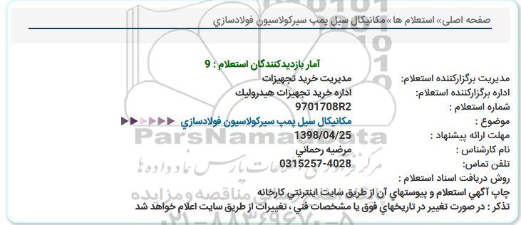 استعلام مکانیکال سیل پمپ سیرکولاسیون فولادسازی , استعلام, استعلام مکانیکال سیل پمپ سیرکولاسیون فولادسازی