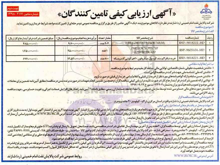 شرکت پالایش نفت امام خمینی (ره) شازند در نظر دارد کالاهای موضوع بند یک آگهی حاضر را از طریق برگزاری مناقصه عمومی دو مرحله ای از تامین کننده واجد شرایط خریداری و تامین نماید.