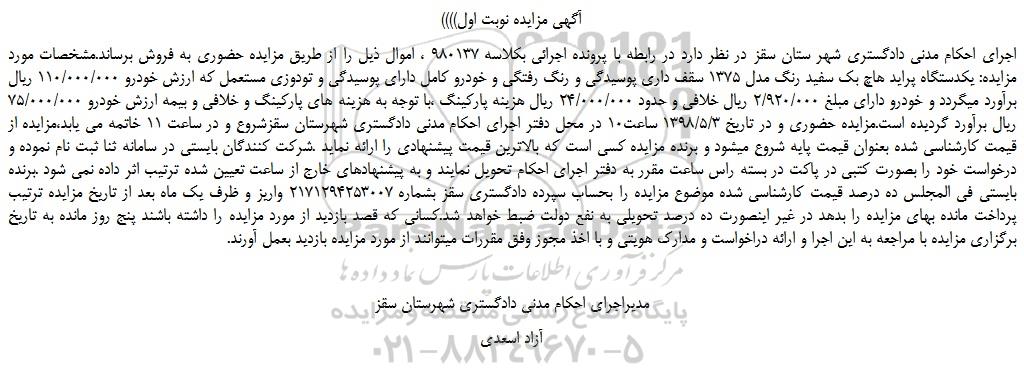 مزایده، مزایده فروش یکدستگاه پراید هاچ بک سفید رنگ مدل 1375