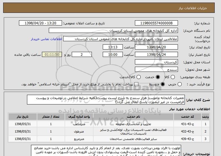 شرح کلی نیاز: تعمیرات کتابخانه ماموستا هژار سنندج به شرح لیست پیوست(کلیه شرایط اعلامی در توضیحات و پیوست الزامیست در غیر اینصورت پاسخ ابطال می گردد)