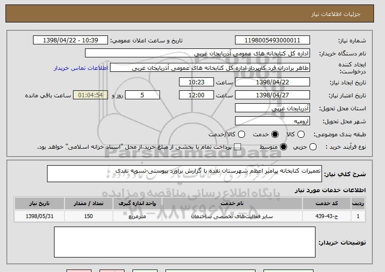 شرح کلی نیاز: تعمیرات کتابخانه پیامبر اعظم شهرستان نقده با گزارش براورد پیوستی-تسویه نقدی