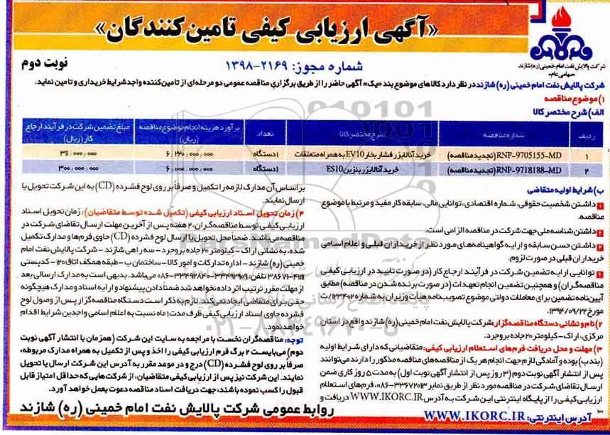 شرکت پالایش نفت امام خمینی (ره) شازند در نظر دارد کالاهای موضوع بند یک آگهی حاضر را از طریق برگزاری مناقصه عمومی دو مرحله ای از تامین کننده واجد شرایط خریداری و تامین نماید.