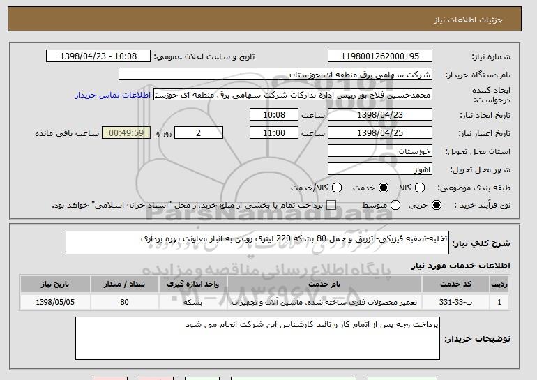 شرح کلی نیاز: تخلیه-تصفیه فیزیکی- تزریق و حمل 80 بشکه 220 لیتری روغن به انبار معاونت بهره برداری