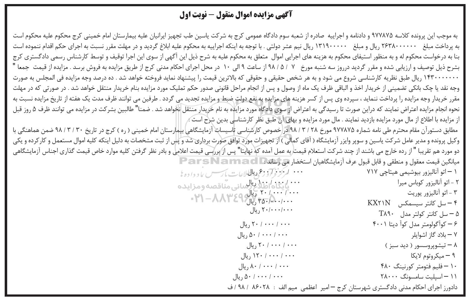 اتو آنالیزور بیوشیمی هیتاچی 600.000.000 ریال، اتو آنالیزور یوریت 100.000.000 ریال، سل کانتر سیسمکس 20.000.000 ریال، سل کانتر کولتر 350.000.000، کوآگولومتر20.000.000 ریال، بلاد گاز اشوایلر50.000.000 ریال، تیشوپروسسور20.000.000 ریال، میکروتوم لایکا120.000.000 ریال، فلیم فتومتر کورنینگ80.000.000 ریال، اسپلیت سامسونگ 50.000.000 ریال