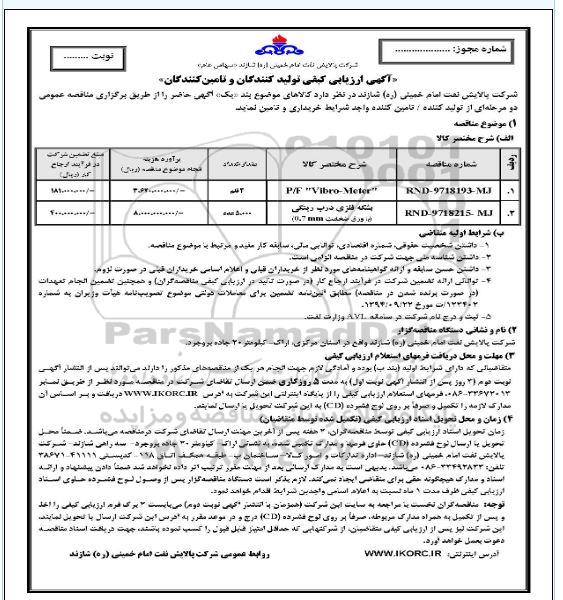 مناقصه P/F VIBRO-METER و ..., آگهی ارزیابی کیفی,مناقصه P/F VIBRO-METER و ...