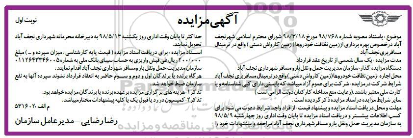 موضوع: به استناد مصوبه شماره 98/768 مورخ 98.03.18 شورای محترم اسلامی شهر نجف آباد در خصوص بهره برداری از زمین نظافت خودروها زمین کارواش دستی واقع در ترمینال مسافربری نجف آباد
