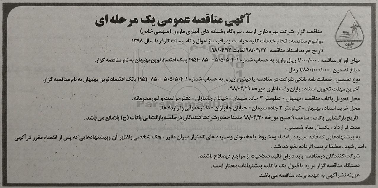 موضوع مناقصه : انجام خدمات کلیه حراست و مراقبت از اموال و تاسیسات کارفرما سال 1398