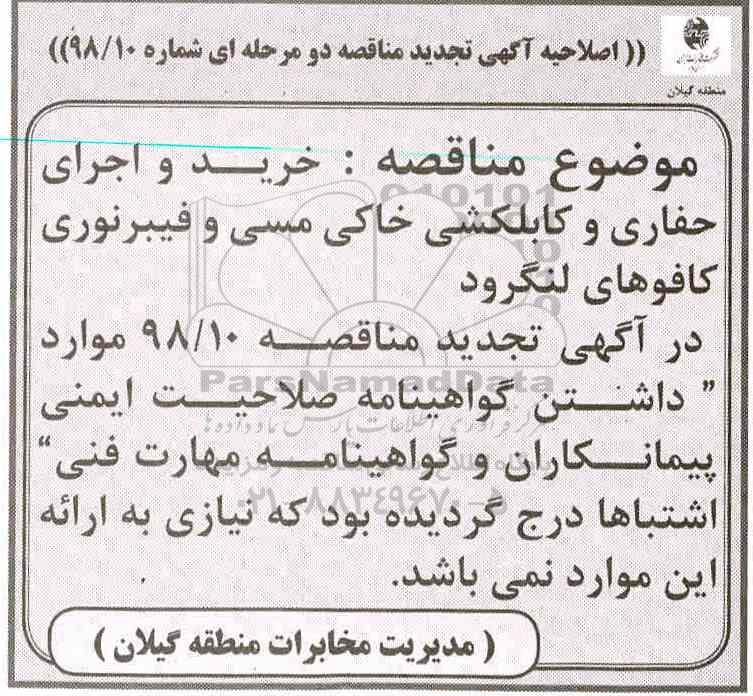 اصلاحیه مناقصه خرید و اجرای حفاری و کبلکشی خاکی مسی و فیبر نوری از کلیه افراد متخصص و شرکتها واجد شرایط دعوت به عمل میآید در مناقصه با کد خبرگزاری پارس نماد: 1776373 شرکت نمایند.