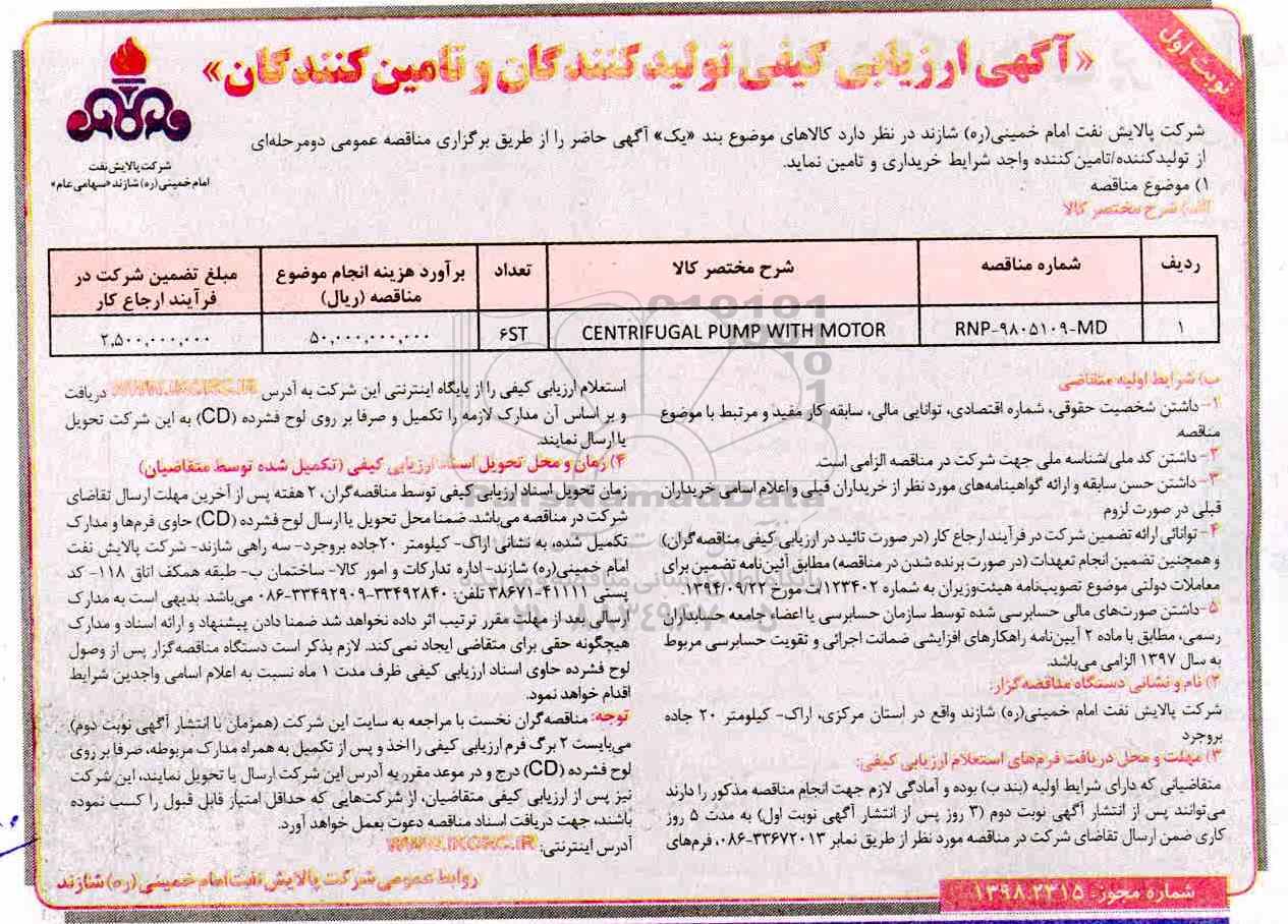 ارزیابی کیفی CENTRIFUGAL PUMP WRRH MOTOR از کلیه افراد متخصص و شرکتها واجد شرایط دعوت به عمل میآید در مناقصه با کد خبرگزاری پارس نماد: 1776776 شرکت نمایند.